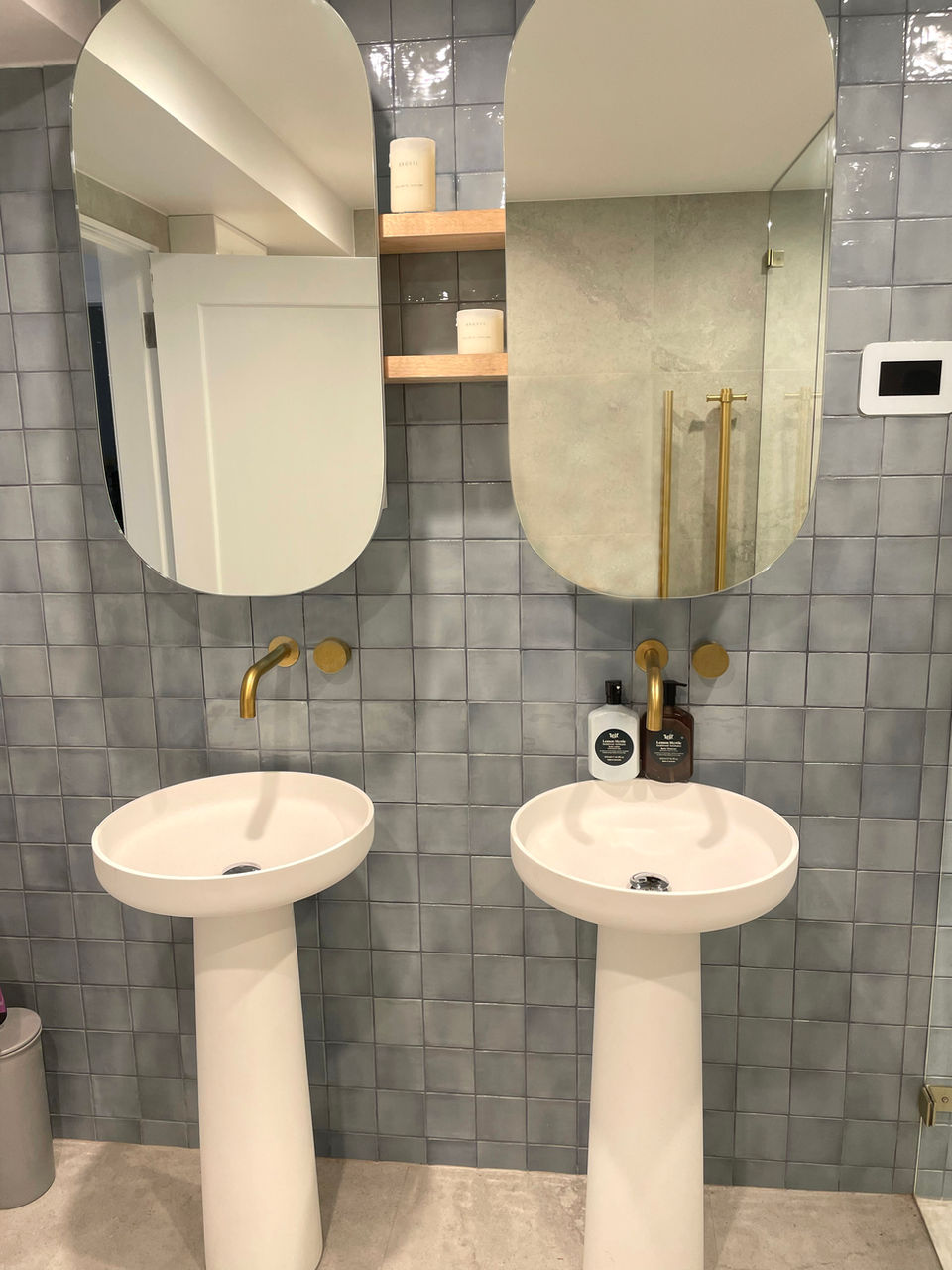 The textured feature wall tiles cast subtle hues of blue. These have been paired beautifully with the large floor stone tiles, providing a natural, grounding element to the space.